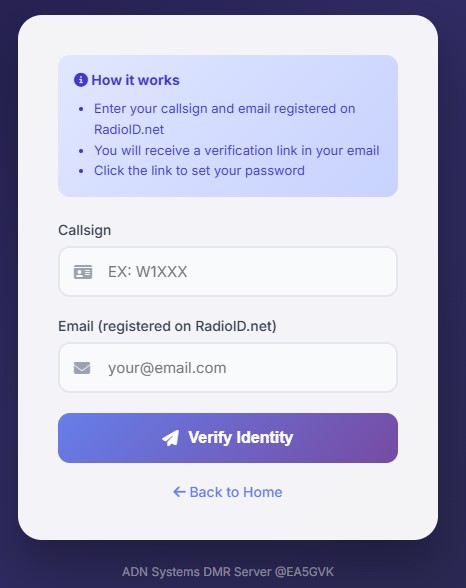 3 . Enter your callsign and email address registered on RadioID.net, and click the “Verify Identity button“. You will receive a link in your email address, which will allow you to access the selfcare panel.